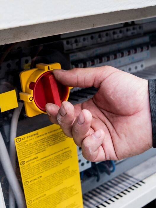 Na zamieszczonym zdjęciu widoczna jest wtyczka przemysłowa CEE w kolorze czerwonym, trzymana w dłoni operatora, na tle panelu rozdzielczego wyposażonego w gniazda tablicowe CEE. Jest to typowy przykład infrastruktury zasilania odbiorników trójfazowych stosowanej w przemyśle, warsztatach, na placach budowy oraz w instalacjach tymczasowych.